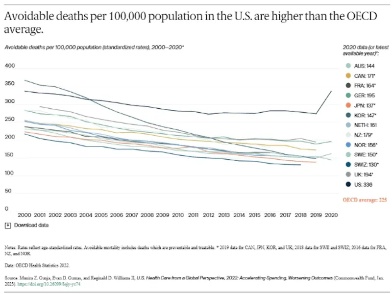 Americans don’t take care of themselves. The Commonwealth Fund calculates that there are 336 avoidable deaths per 100,000 lives in the population, versus the OECD average of 225.